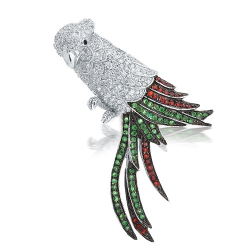 This fabulous parrot pin has a lot to say about your fashion savvy. Our Multi Color Green Red Garnet CZ Diamond Parrot Brooch Pin Pendant is a real tropical beauty. A sensational multi color brooch made of dozens of glittering white CZs and a dazzling plumage of green and garnet CZs. This appealing parrot brooch will add jungle heat to any outfit you pair it with. A glittering CZ pendant bail is attached if you are looking for a stunning necklace alternative. Buy this bewitching garnet cz diamond pin today and enjoy its versatility and verve. Please note that a chain is NOT included in the sale.
